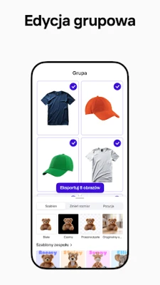 Photoroom z łatwością radzi sobie z wyzwaniami edycji. Precyzyjne usuwanie i zamiana tła to tylko początek – inteligentna gumka pozwala dopracować najdrobniejsze detale, eliminując wszelkie rozpraszacze. Edytor zdjęć AI umożliwia usuwanie niechcianych obiektów, oczyszczanie obrazów i dopasowywanie oświetlenia, cieni oraz ostrości, aby uzyskać bezbłędny efekt. Ponadto, możesz prezentować ubrania na realistycznych modelach wirtualnych, umieszczać produkty w zapadających w pamięć sceneriach i ożywiać fotografie dzięki generatorowi wideo. Photoroom wspiera spójność marki, umożliwiając przechowywanie logotypów, kolorów i czcionek w jednym miejscu oraz oferuje edycję partii dla wielu zdjęć jednocześnie, idealną dla sklepów internetowych i twórców treści. Twoje grafiki będą zawsze zoptymalizowane pod kątem platform takich jak Shopify, Amazon, Instagram czy YouTube.